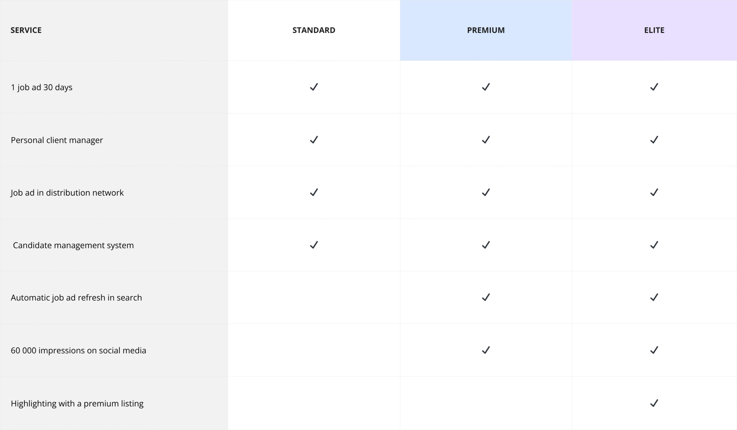 Job ad is permanently displayed as one of the top ads in the selected category for seven days. The number of premium job ads is limited and therefore no premium job ad will go beyond the front page of the category.
